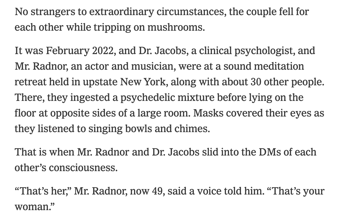 — turns out “how How I Met Your Mother star Josh Radnor met his wife” is weirder than anything that happened on the show where a guy voiced by Bob Saget explained the various sexual conquests of his 20s and 30s to his children, as evidenced by passages like this from the incredible NYT story about their relationship