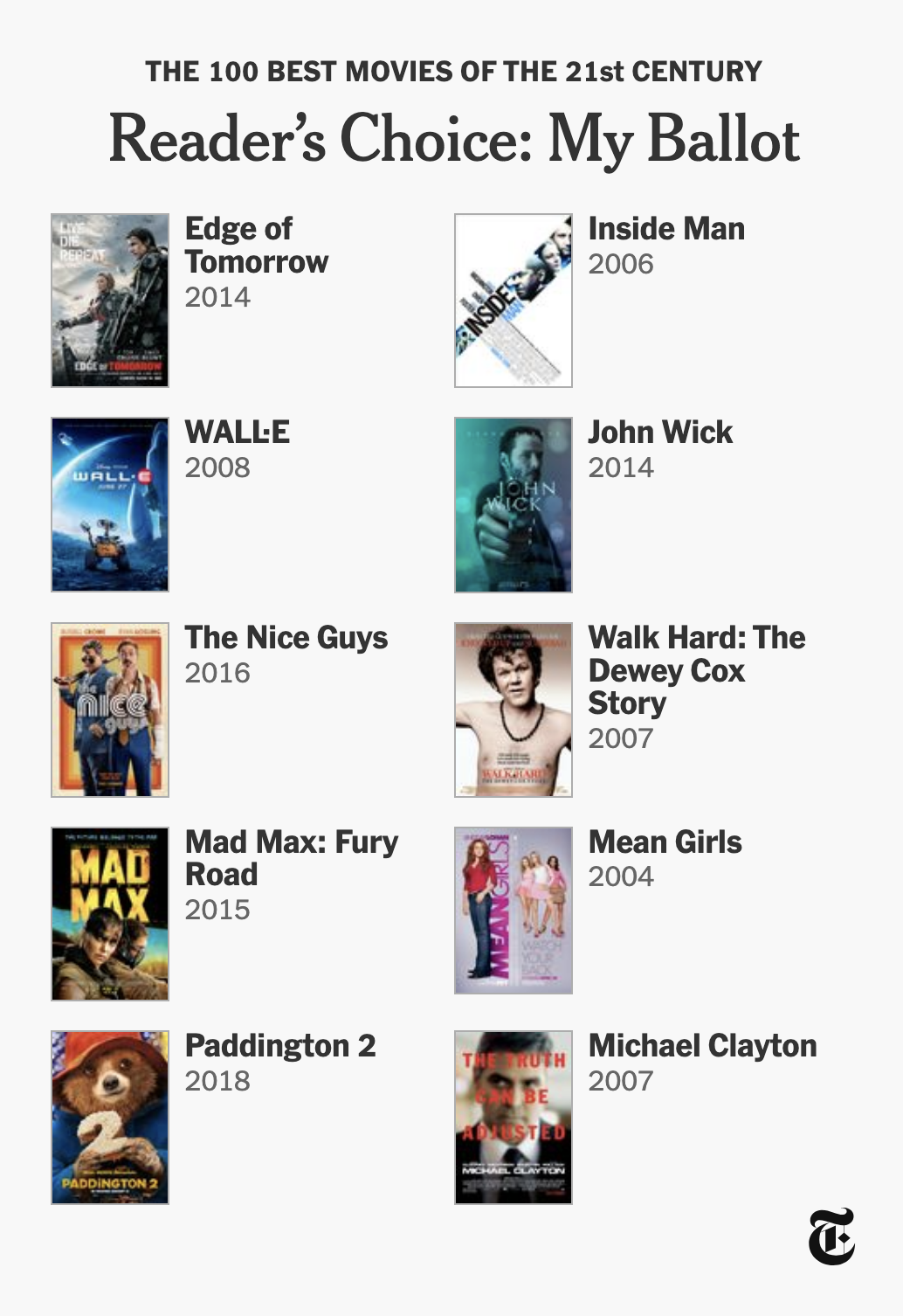 — the NYT revealed its list of the best movies of the 21st century (so far) (obviously), which is great and all, but my favorite part was how they let everyone submit their own ballot, which led to a bunch of people I follow on social media posting screenshots of their picks and reminding me how much I liked a lot of movies I forgot about, and then led to existential panic as I made my list (posted below) and considered things like “do I pick ‘best’ like technical and artistic achievements or ‘best’ like my personal favorites?” and “how do I rate a movie that came out recently if I don’t know how it will hold up to time and rewatches?” and “HOW DID OUT OF SIGHT COME OUT IN 1998?????”
